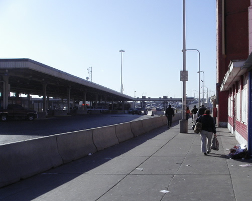 反対側メキシコからアメリカ入国を待つ車の渋滞が見えるでしょうか・・午後はこの反対、つまりメキシコへ帰る車で大渋滞が起こります。 |